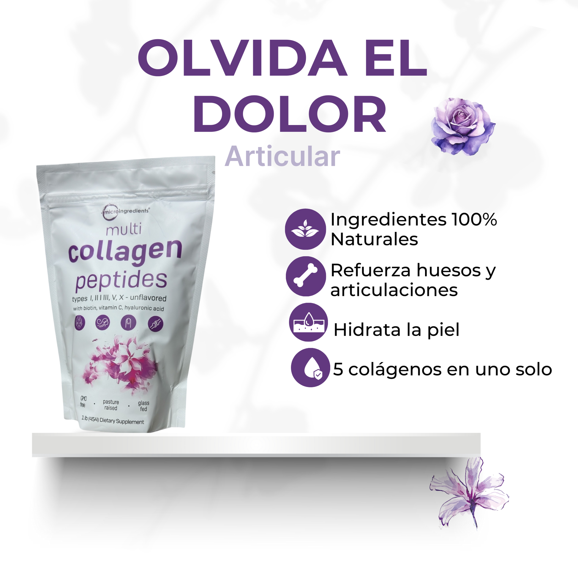 • 5 tipos de colágeno en uno solo: apoyan huesos, piel y articulaciones.