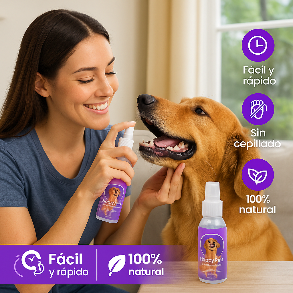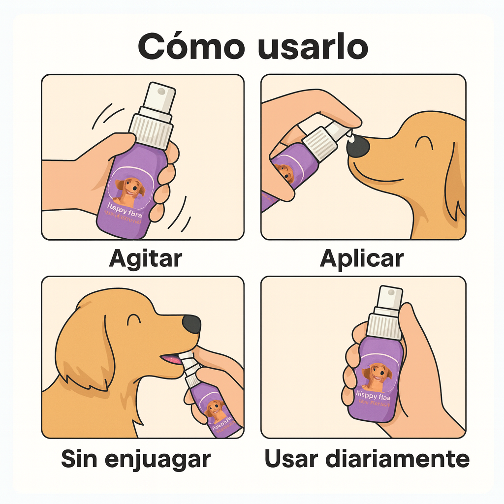 Aplicar el spray: Rociar 1 a 2 veces a cada lado de la boca, según el tamaño de la mascota.